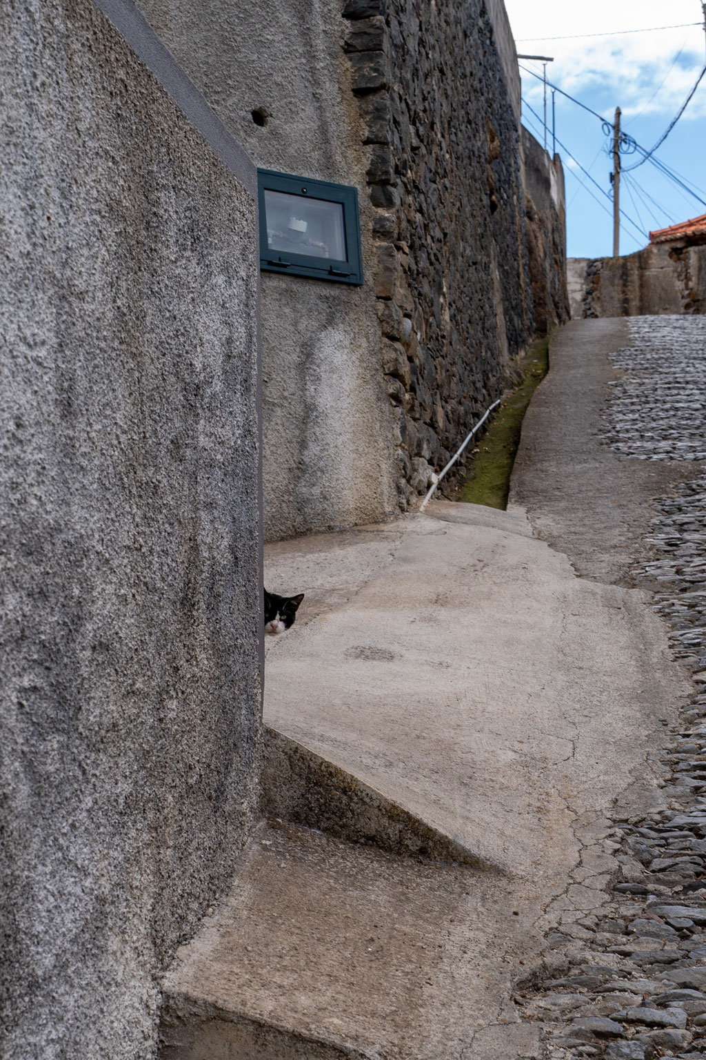 Wir haben im Ort Ponta do Sol fast auf Meereshöhe geparkt und den für den ersten Tag zünftigen Anstieg (400 Höhenmeter auf 2km) auf uns genommen. Die Krönung sind die letzten 300m Strecke: Hier sind Stufen in der Mitte der Straße, damit der Fußgänger nicht gleich auf dem Hosenboden landet.