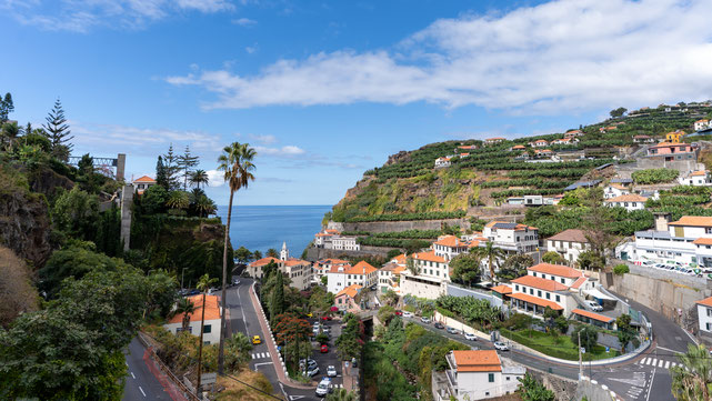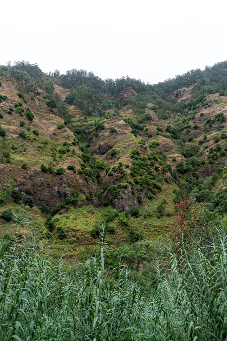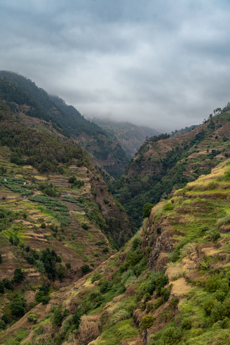 Tiefe Schluchten und steile Berghänge prägen die spektakuläre Berglandschaft. Die Flora aus mehreren Klimazonen verteilt sich auf Madeira über die Höhe eines Berghanges - unten Buschwerk, oben Nadelhölzer.