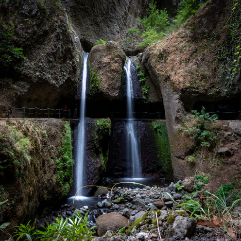 Im letzten Drittel der Levada Nova kommt man zu einem ca. 200m langen unbeleuchteten Tunnel (Taschenlampe hilft). Direkt dahinter befindet sich eine enge Schlucht und der Weg führt hinter den beiden Wasserfällen vorbei wieder hinaus ins Tal. Ein Highlight mit Erfrischung.
