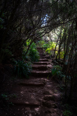 Von hier geht es ein Stück des Weges zurück und dann über Treppen hinab zur Levada das 25 Fontes.